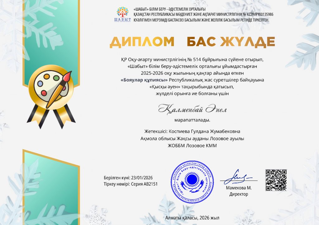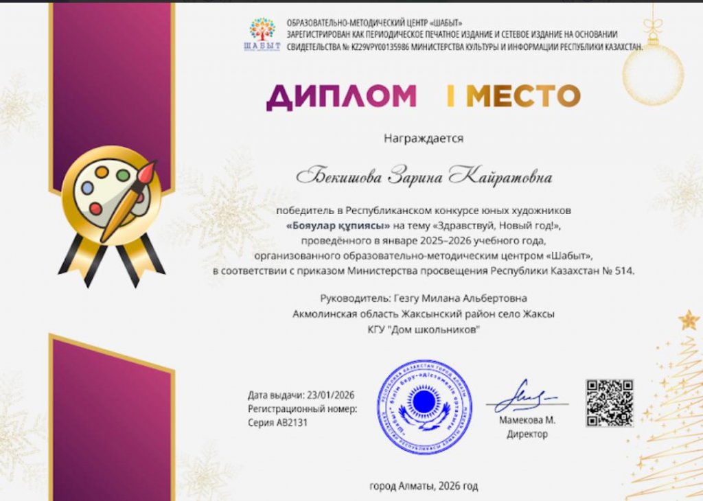 2025-2026 оқу жылының желтоқсанында Республикалық қосымша білім беру орталығы "Аяз Ата шытырман оқиғалары" тақырыбында онлайн сурет байқауын өткізді. Қожахметова Нармин "Оқушылар үйі" КММ Ақмола облысы Жақсы ауылының атынан қатысты. Нармин бірінші орынды лайықты...