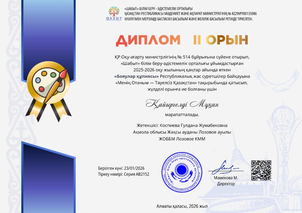 05.01.2026 жылы "Шабыт" шығармашылық орталығы "Ілияс окулары" республикалық байқауын өткізді. ІІ дәрежелі дипломды "Оқушылар үйі" КММ тәрбиеленушісі - Қайыргелді мұқан алды. Жетекшісі-Коспиева Гүлдана Жұмабекқызы. "Ілияс окулары" байқауы оқушылардың...