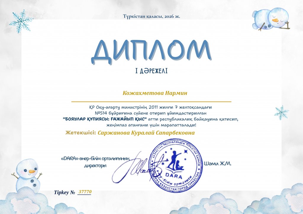 Түркістан қаласының "DARA" қосымша білім беру орталығы 2026 жылдың ақпан айында "Ғажайып қыс" тақырыбында суреттер байқауын өткізді. Суреттер байқауына "Волшебная бумага" үйірмесінің тәрбиеленушісі Қожахметова Нармин қатысты. Нармин өз суреттерінде қыстың...
