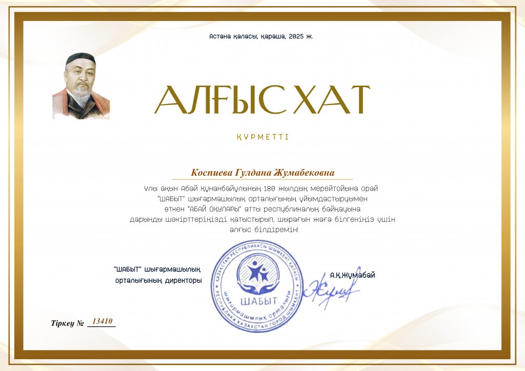 Астанада қараша айында ұлы ақын Абай Құнанбайұлының 180 жылдығына орай «Шабыт» шығармашылық орталығының ұйымдастыруымен «Абай оқулары» республикалық байқауы өтті. «Абайдың асыл мұрасы» номинациясында «Алтын кілт» клубының тәрбиеленушілері марапатталды: Насиба Мураханқыны - 1-дәрежелі диплом, Қайыргелді Мұқан - 1-дәрежелі диплом, үйірме жетекшісі Қоспиева Гүлдана Жұмабекқызы Алғыс хатпен марапатталды.